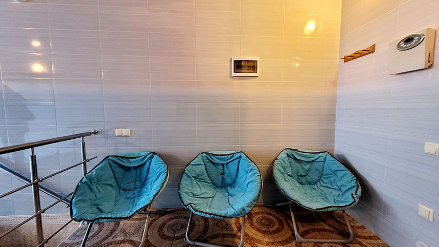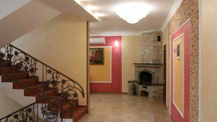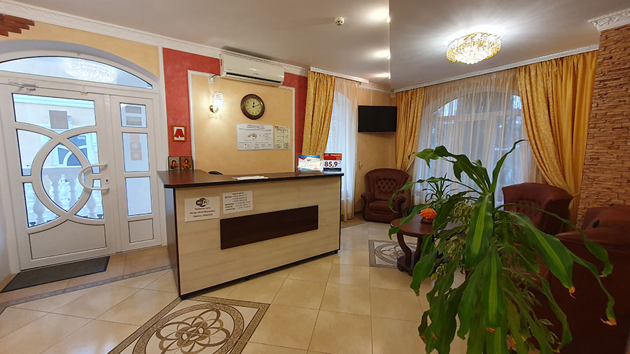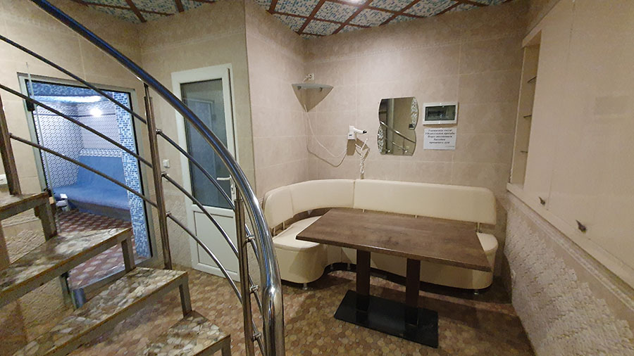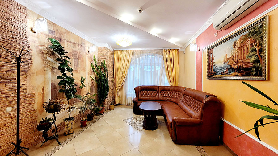 Ожидание будет не таким томительным, если находишься в красивом месте. Так, к примеру, ожидать такси можно в стильной и уютной гостиной, расположившись на удобном диване и включив любимый канал на ТВ. Радует глаз и камин, удачно расположившийся в углу гостиной. Здесь много внимания уделено деталям: комнатные растения, освещение, текстиль — все подобрано со вкусом.